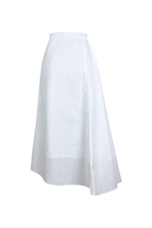 Asymmetric midi skirt that gathers on one side of the waist. Invisible zipper closure at the side seam.