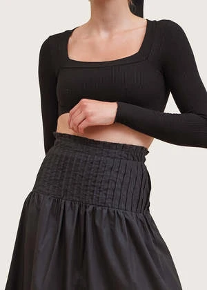 Lightweight high-waisted midi skirt with a ruched waistband and pleats in black cotton. Features zip and fish hook closure at side.