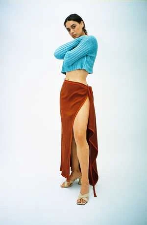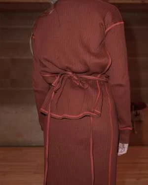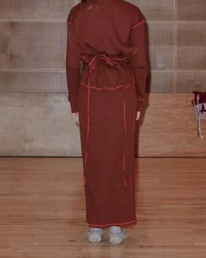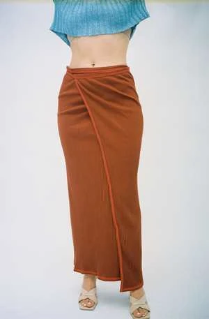 Ribbed cotton jersey wrap skirt in a brick red color with exposed contrast seams.