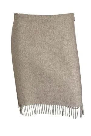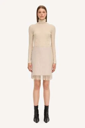 This skirt by by Malene Birger features a mini skirt length with a high waist, a gentle A-line silhouette, and delicate fringes along the hemline.