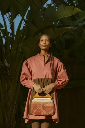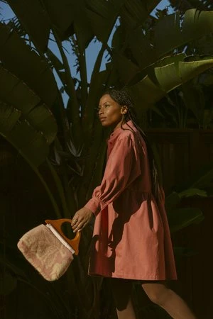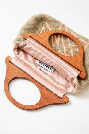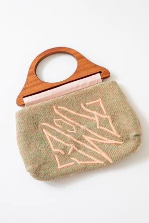 We’re always looking for fun ways to use some of our smaller vintage textile pieces, and we’re so excited about how this idea turned out! Wool blanket exterior, lined with soft pink satin, with a mahogany handle made locally in Long Beach. Bag measures about 10″ wide.