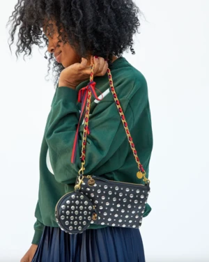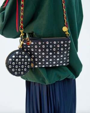 The Wallet Clutch with Tabs in black nappa leather with studs is perfect for small essentials! Transform it into a minimal crossbody or shoulder bag with the attachment of a strap (not included), or throw it into any larger bag to stay organized.