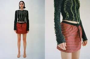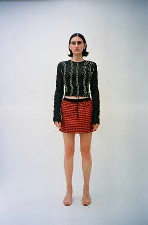 Red and dark brown gingham mini skirt. Black drawstring tie closure for an adjustable fit. Made from a Japanese Organic Nylon. It is durable, water-repellant, and lightweight.