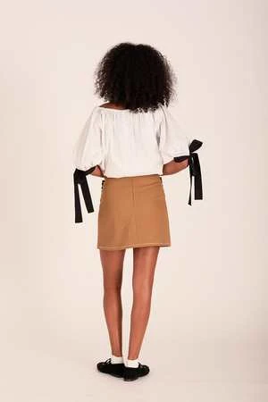 The Tate skirt is a high waisted a-line mini skirt with our signature ruffly patch pockets on the front. This toffee brown twill version has contrast white top-stitching and an invisible zip at the back. Even though it’s mini we suggest going with your normal size, however if you’re between sizes we suggest going up!