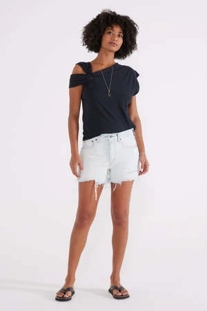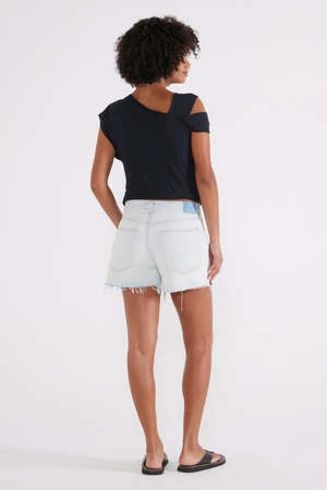 A relaxed fit that sits comfortably at the hip with a tattered hem and a button fly. Thoughtful destruction adds to the authenticity of the aged light wash.
