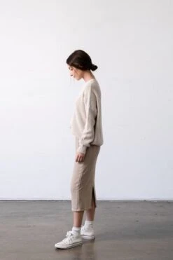 DESCRIPTION: DRAPED LACE MIDI SKIRT MADE OUT OF RECYCLED CURTAIN FROM LOCAL CHARITY SHOP. SIDE CLOSURE WITH A ZIP AND SIDE POCKET TOO