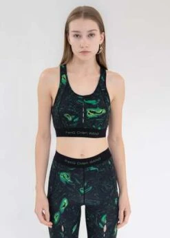 Slim fit yoga bra featuring seasonal phoenix-motif all-over print. Tonal stitching.