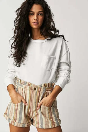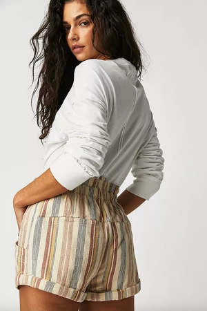 Perfectly printed and just as classic, these staple shorts will turn heads with every wear. Featured in a high-rise, slim silhouette, with paper bag-inspired waistband, yarn-dyed striped fabrication, angled dropped pockets and a smocked waist for ease. A beachy staple!