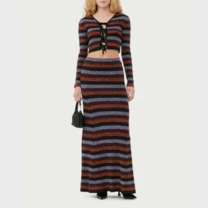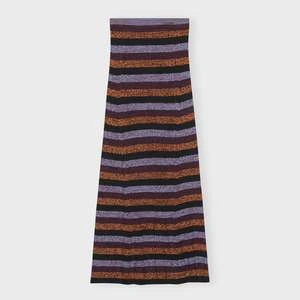 Long Merino wool maxi skirt with elastic waistband in black, red and lavender stripes.