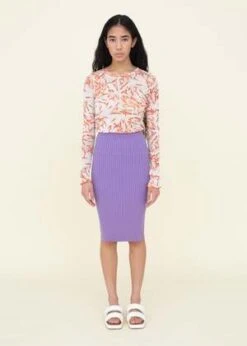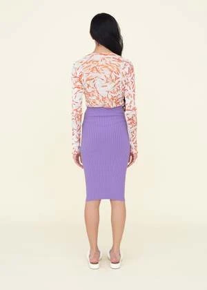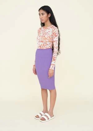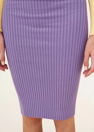 Fitted tube skirt from GIU GIU in a ribbed, purple cotton-nylon knit blend. Pull-on style with an elasticized high waist. Knee length. It can also be worn as a dress.