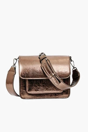Crossbody bag with magnetic closure and adjustable strap. The bag has an outer front pocket and one large compartment with an inner pocket.