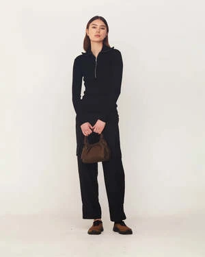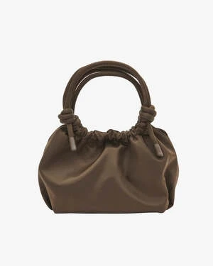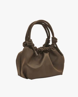 Mini handle bag with magnetic closure and knotted detailing on the handles. The bag has one compartment with one zipper-closed inner pocket.