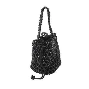 Decorative pouch handle bag. The bag contains one compartment and a drawstring closure.