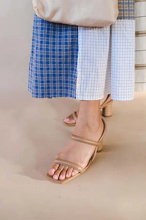 Intentionally Blank Kifton heeled sandal in clay light tan leather. Combines puffy straps, and lots of exposed foot to create a flattering and elongating shape.