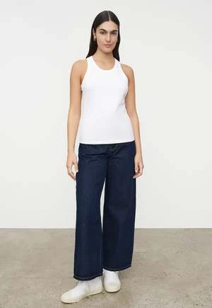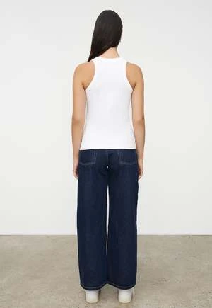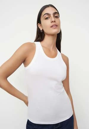 A fitted singlet with a racer back and ribbed binding around the neck and armholes, made from mid-weight organic cotton jersey.