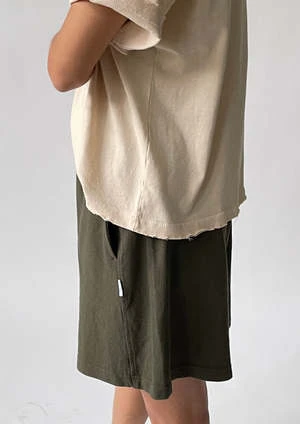 Why are most knit shorts super short, thin and tight? We needed heavy weight knit high waisted, A-line, not showing too much skin modern retro basketball shorts! Flattering design with a slightly shorter out seam and perfect mid thigh length. This beauty is made in 100% cotton heavy weight low gauge knit. Super raw textured yet soft and airy! She is garment dyed and pre-washed for a rich textured look with an ultra soft hand.
