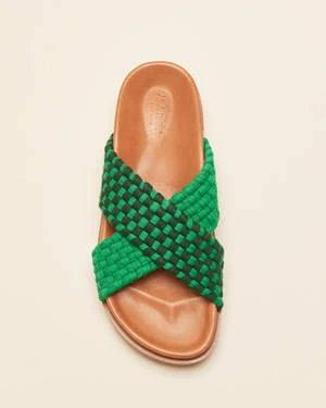 a perfect summer slide that features hand braided cotton fabric upper, molded soft leather footbed, logo-embossed insole and moulded rubber outsole