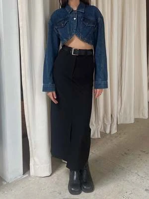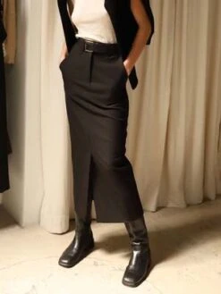 The most sleek closet staple for your closet this season: the Black Front Slit Belted Midi Skirt. A sleek, stretchy, fitted high waisted skirt that is begging to be worn with tall boots & a fitted tank. Includes pockets & a removable vegan leather belt
