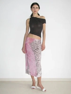 Fine, delicate, slightly sheer skirt featuring bow digital print. Color pink.