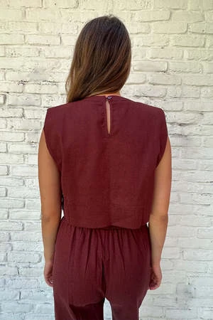 Nara crop tank with side ties and shoulder pads in cocoa red-brown color.