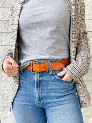 Exclusively made for us by local and beloved leather goods company, Uptmor Saddlery, this belt was designed to work in the belt loops of denim as well as over dresses, sweaters or outerwear pieces. It is 1.25in wide and has a roller brass buckle. This essential piece is timeless, unisex and of the highest quality.