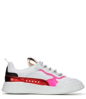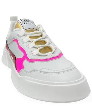 : White, fuchsia, and red lace up sneaker with vegan leather upper and five star Premium Basics logo detailing.