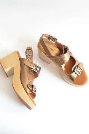 Double strap slingback clog sandal with a chunky wooden platform sole.