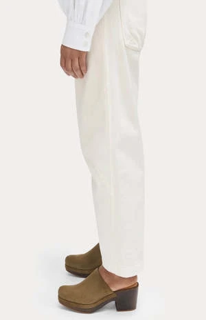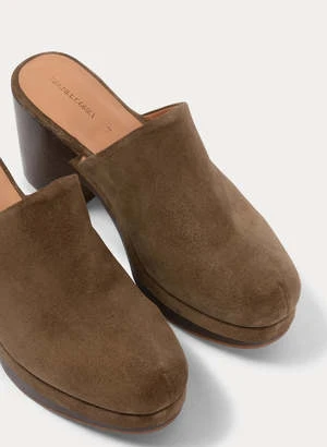 A new version of our beloved closed toe Bose Clog with carved wooden platform, in taupe Split Suede Leather.