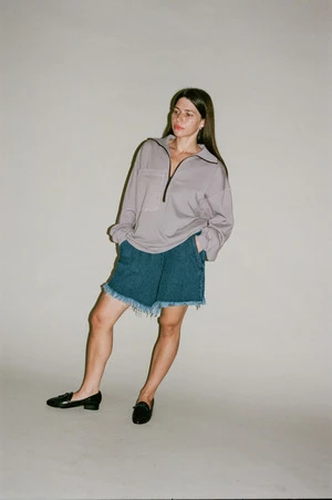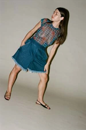 – Wide, swingy shorts with an elasticized waistband and slanted raw hem, in soft Washed Burbank denim.