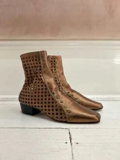 Heeled ankle boot in Bronze. The Studded Cove Boot features a zipper closure at the side, square toe, and stacked heel.
