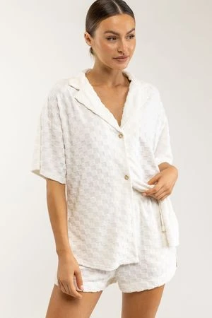 Two of our heroes together at long last in the form of a high-waisted short. Cut from off-white, exclusive jacquard terry fabrication, it has a neatly curved hem, in-seam pockets and is perfectly suited to lounging about while you dry off. Towel off even quicker by pairing it with the Jacquard Terry Shirt for the full experience.