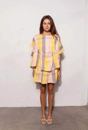 Our newest high waisted shorts with its wide, drapey leg that hits a few inches above the knee, featuring pleats at front waist elastic at back , side pockets and side button closure.