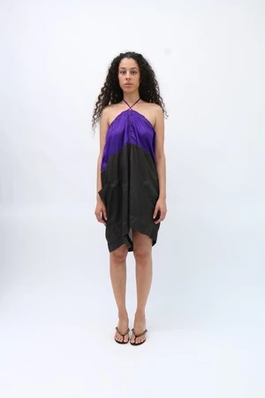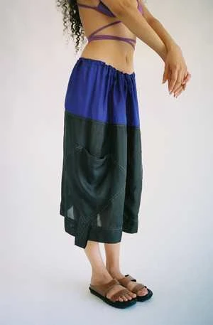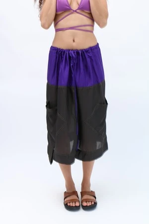 This striking colorblock skirt from SC103 is crafted from super lightweight silk, combining the elegance of black and the vibrancy of purple. Its flowing design, featuring drawstring waist and large airy pockets, and contrasting hues create a piece that effortlessly blends ease and boldness. Can be worn as a skirt or as a minidress. Worn with the Plum Bikini Top.