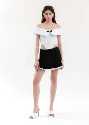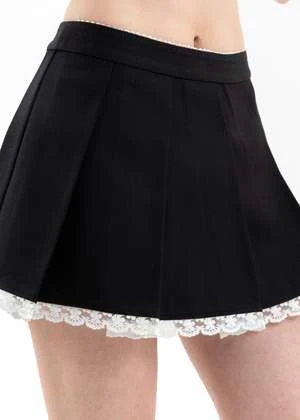 Lace-trimmed pleated mini skirt in black, from Shushu/tong. Features a paneled wool-blend construction with white lace trim along the hem and waist band. Finished with concealed zip fastening along the spine.