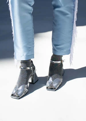 Metallic high heel with 70s inspired straps across front, open square toe with adjustable buckle closure at ankle. Leather covered heel. Crafted from high shine metallic leather in Italy.