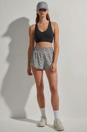 The Varley Kallin Running Short in Mirrored Snake is an easy running short with thick elastic fitted waistband. The inseam on this short is 1.5 inches and it includes a hidden mesh brief inside for added modesty and comfort. Hidden drawstrings make this short adaptable to size. This short also includes a hidden back pocket on the outside of the the waistband to stash l ip balm, keys, or headphones.