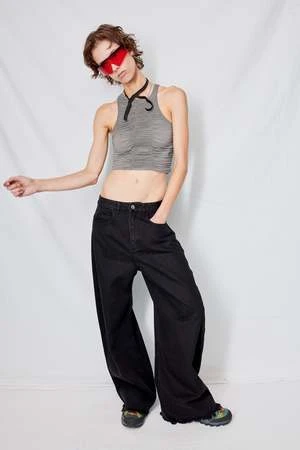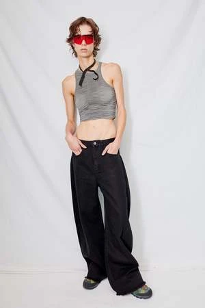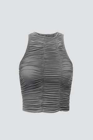 Grey Asymmetrical Ruched Crop Top from Woodrose Deli. Double layered super thin fabric with ruched detail. Asymmetrical neck line, cropped length.